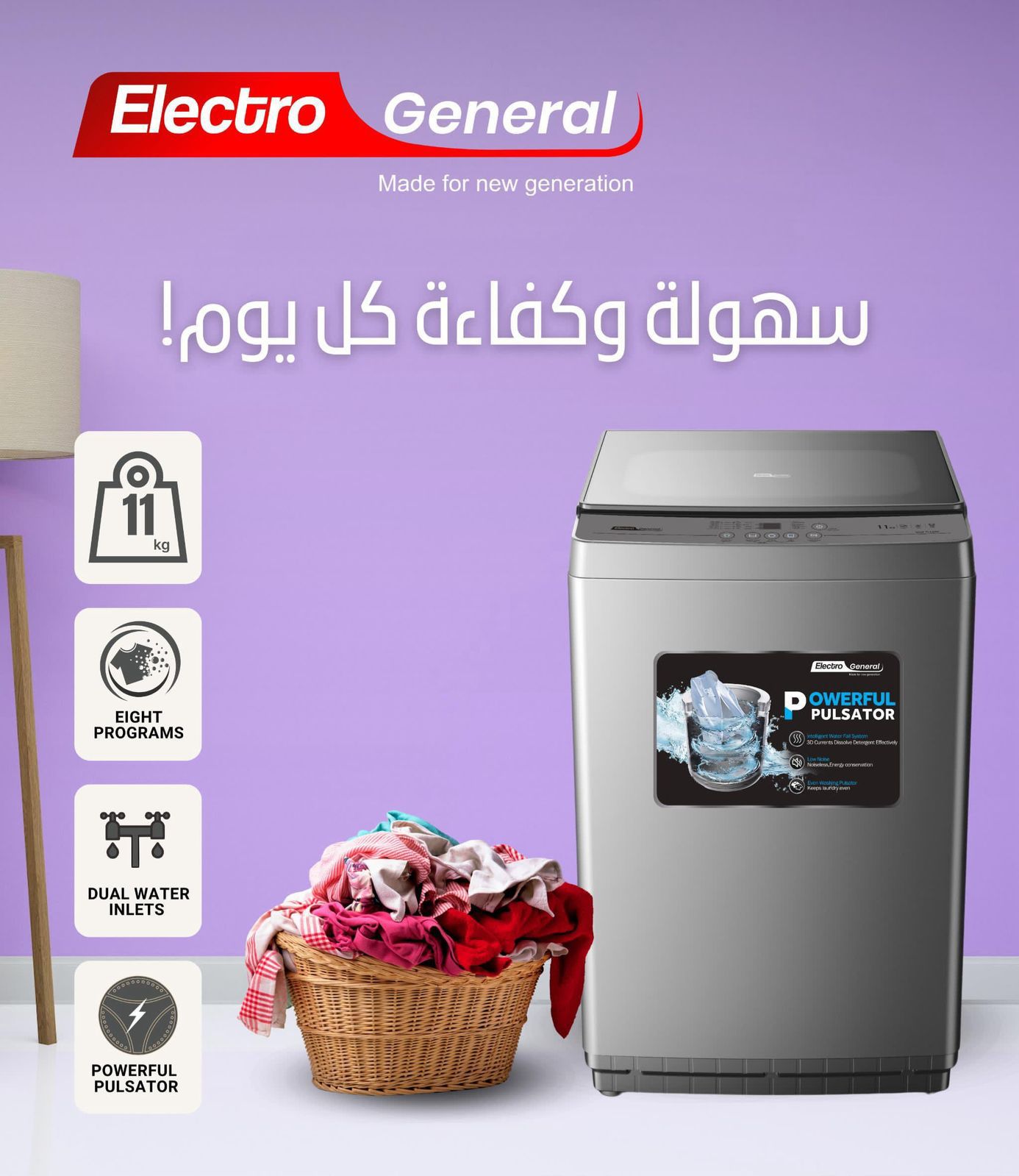 غسالة الكترو جنرال علوية 11 كيلو سلفر WXK-TL1100